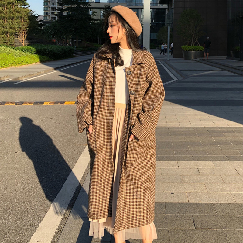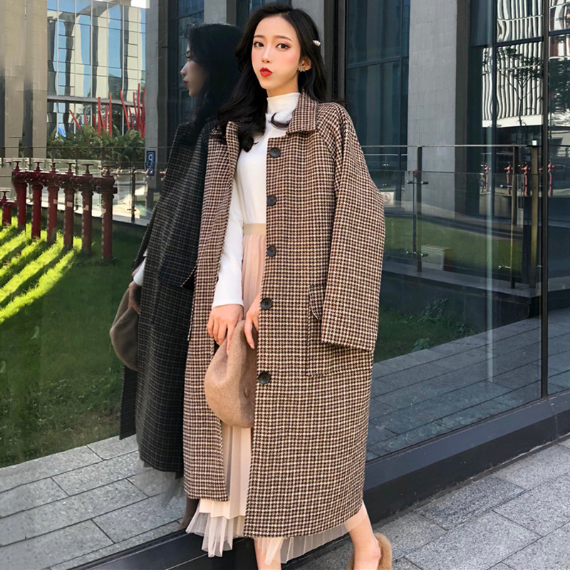 / 2018流行毛呢外套女秋冬裝新款赫本開衫大衣寬松中長款格子風衣潮