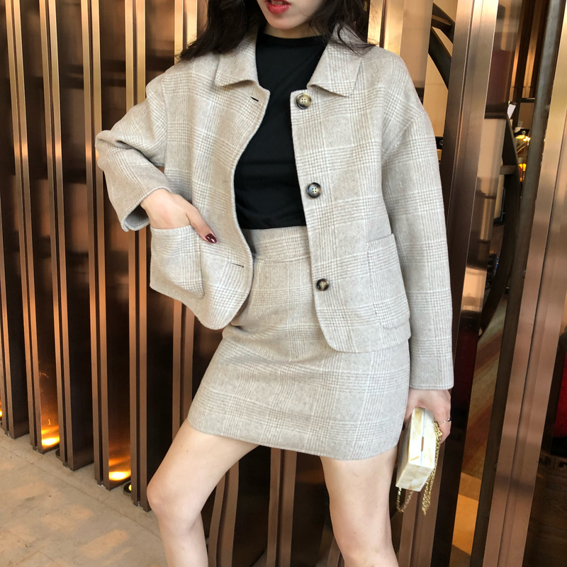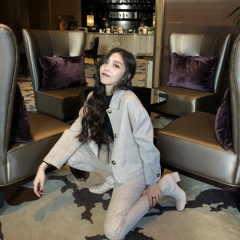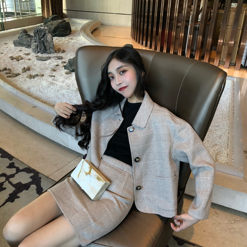 2018秋季時尚套裝韓版復古慵懶格紋外套高腰九分褲半身裙三件套女