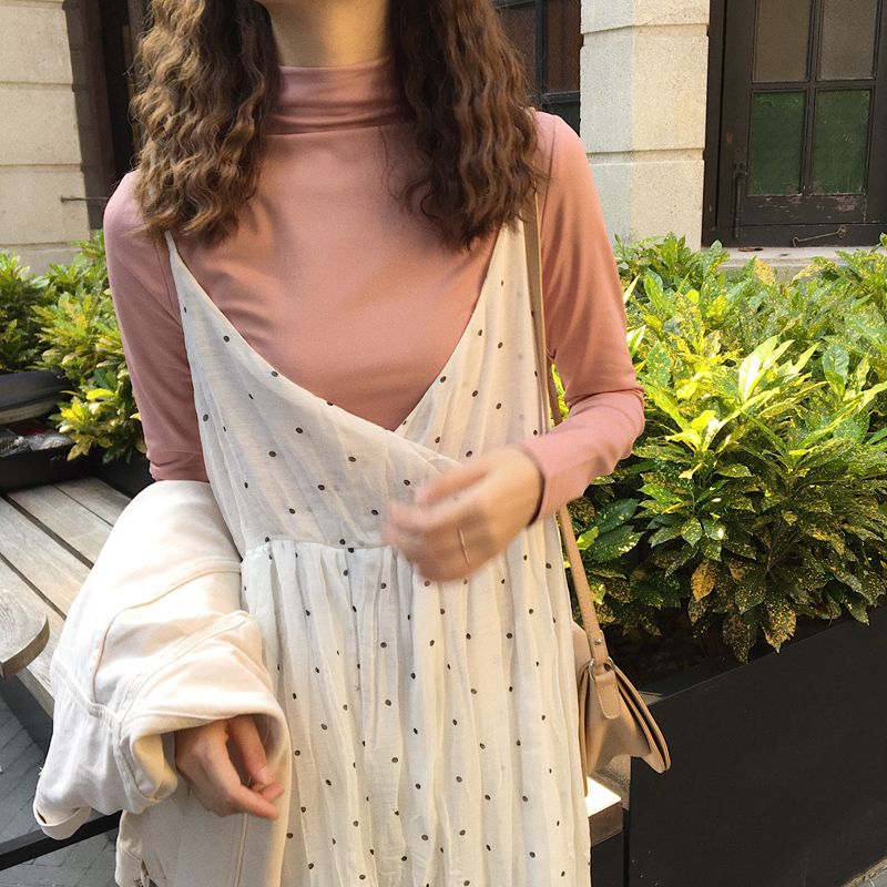 早秋上衣慵懶長袖t袖女內里磨毛棉修身顯瘦半高領純色套頭打底衫