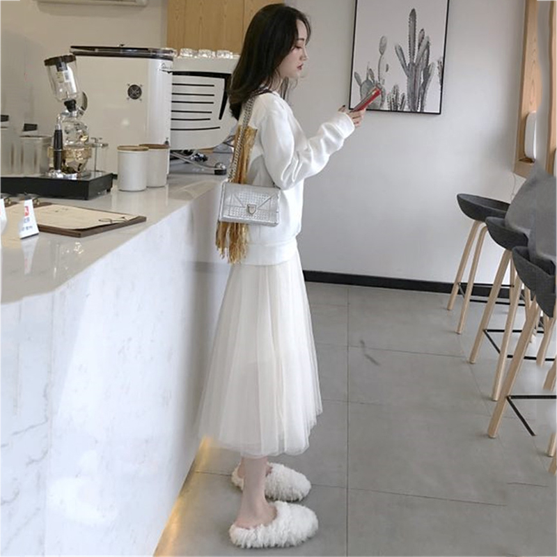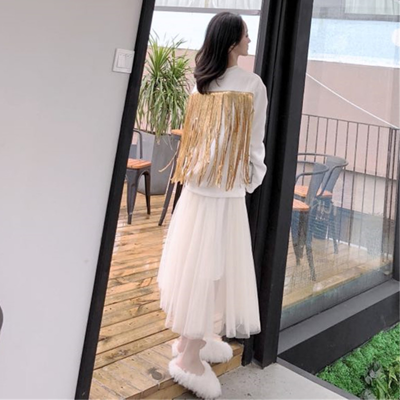 / 氣質女神兩件套冬裝新款后背亮片流蘇衛衣時尚高腰A字網紗半身裙