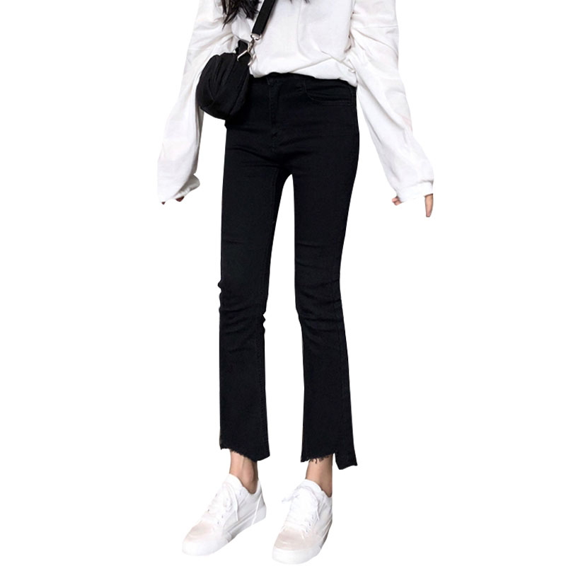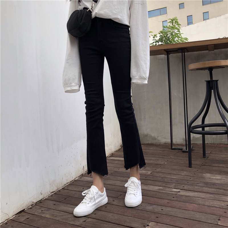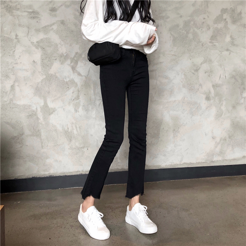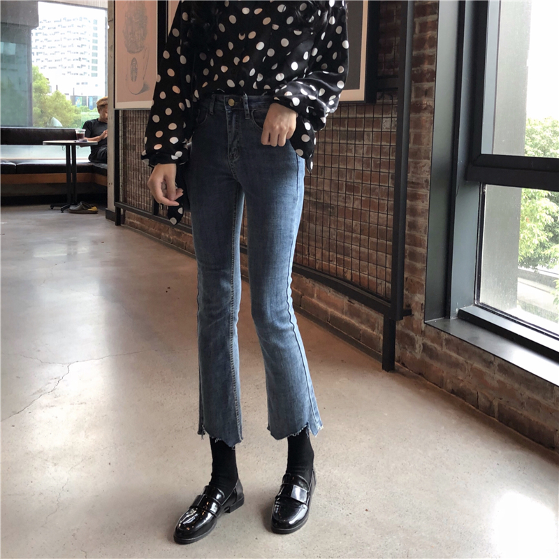 / 秋季女裝韓版彈力高腰顯瘦不規則褲腳牛仔褲直筒褲九分褲學生褲子
