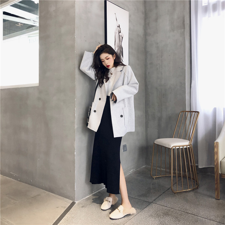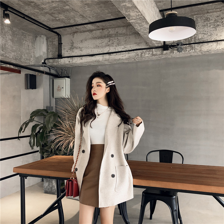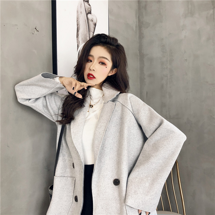 / 小香風復古秋冬新款氣質雙排扣西服領chic百搭寬松中長款毛呢外套