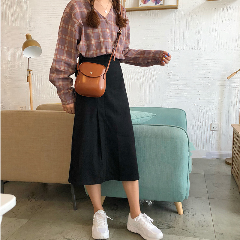 秋季女裝韓版氣質高腰純色開叉半身裙松緊腰顯瘦A字裙包臀裙長裙