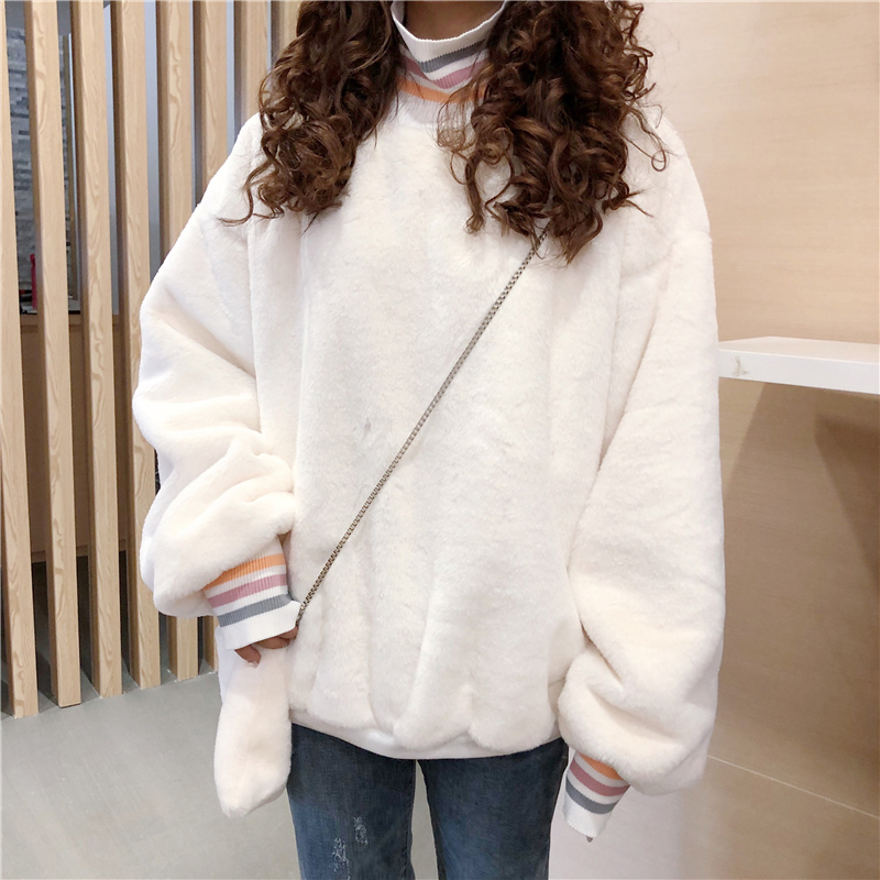 秋冬上衣女新款半高領寬松加絨保暖外套套頭長袖毛絨衛衣+小包包
