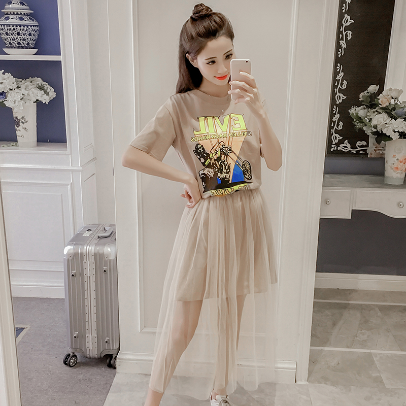夏季新款女裝韓版網紗兩件套裝裙子中長款修身顯瘦短袖連衣裙