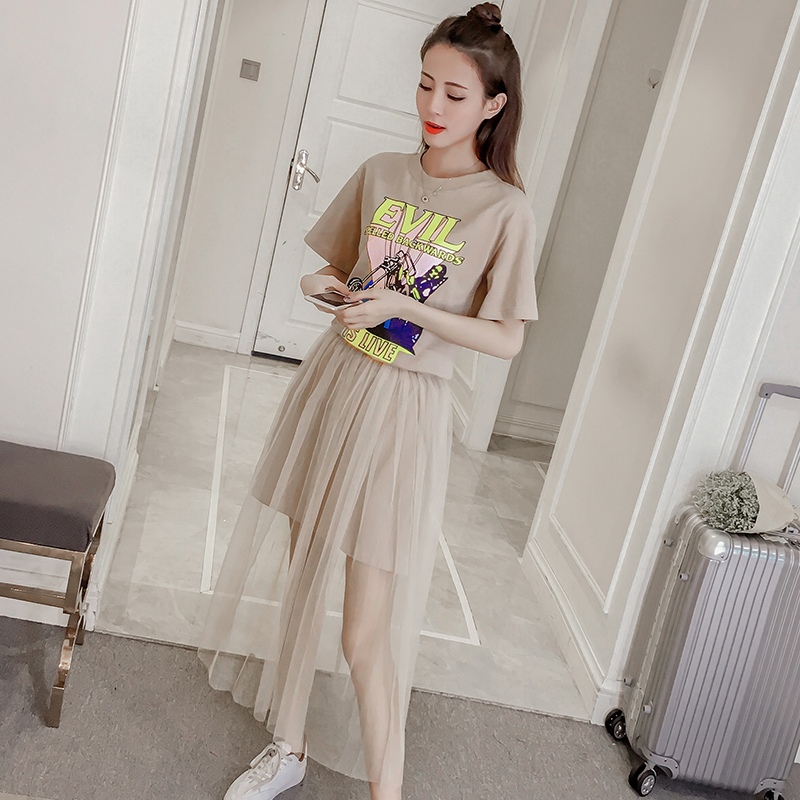 / 夏季新款女裝韓版網紗兩件套裝裙子中長款修身顯瘦短袖連衣裙
