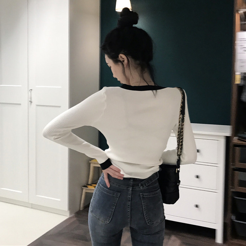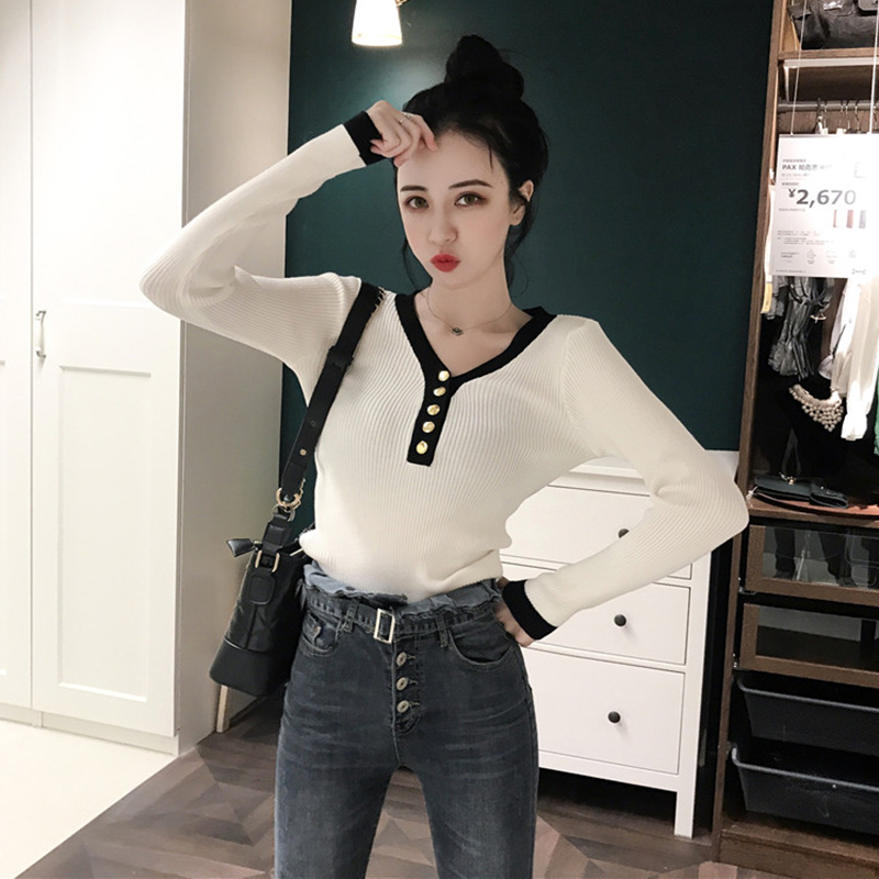 / 韓風氣質拼色V領修身顯瘦長袖針織衫秋裝女2018新款學生打底上衣