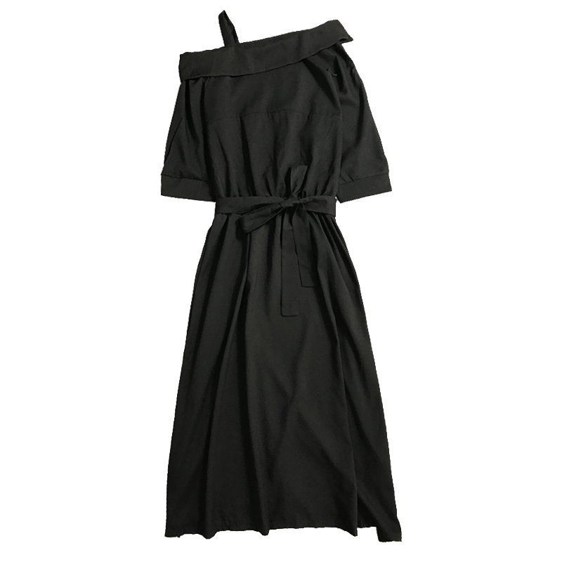 / 女秋裝2018新款純色系帶收腰斜領露肩吊帶中長款學生短袖連衣裙女