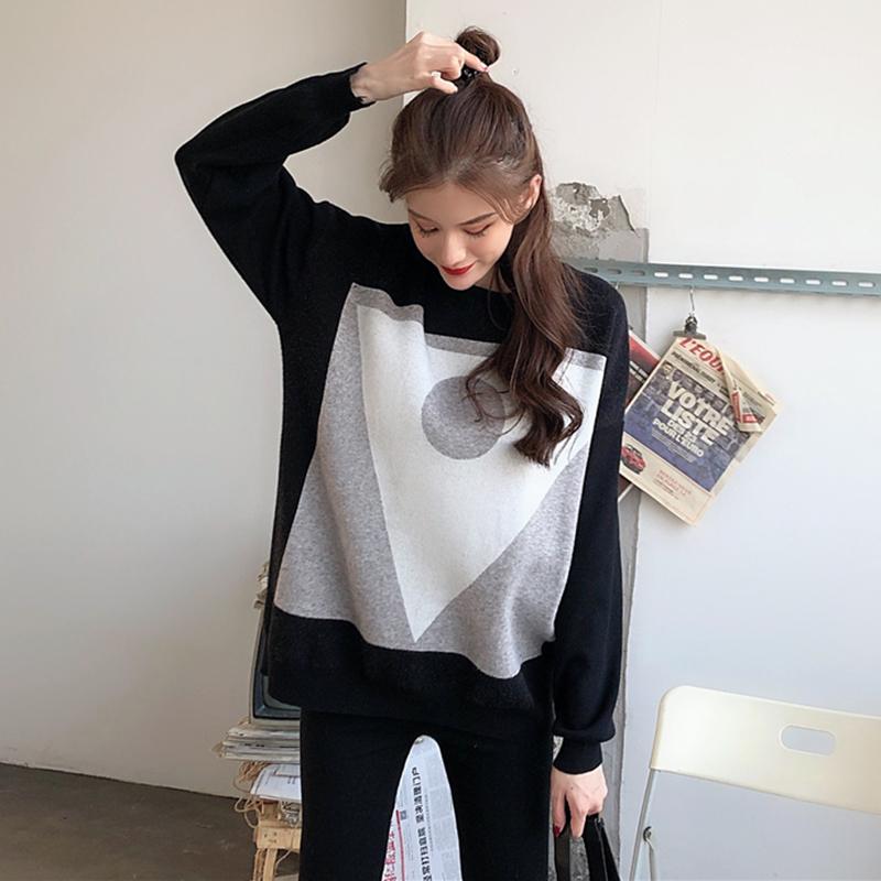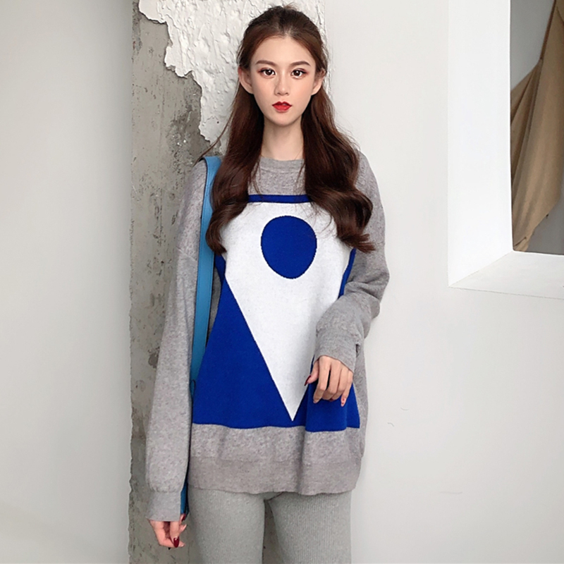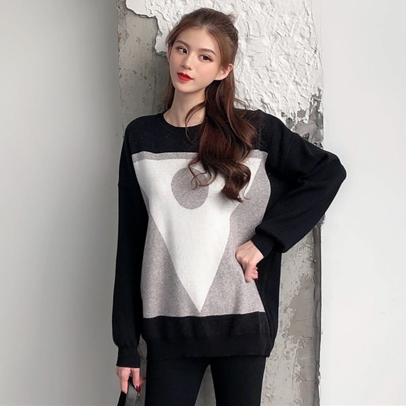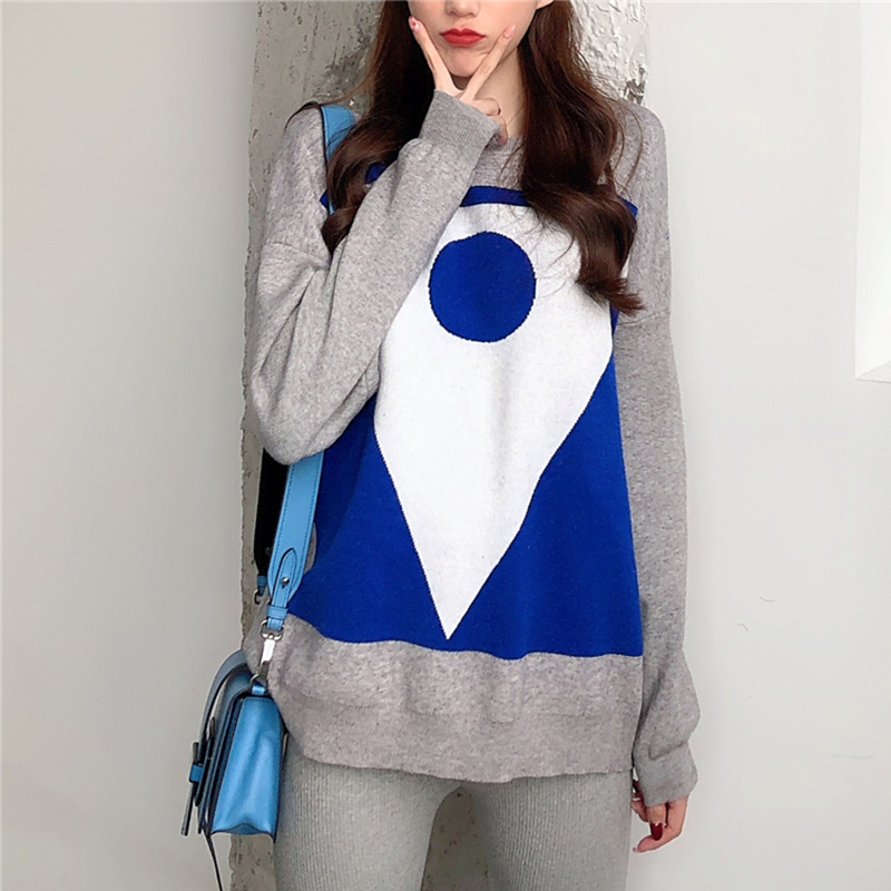 / 時尚拼色圓領針織衫女秋冬裝新款學生寬松毛衣外套慵懶風長袖上衣