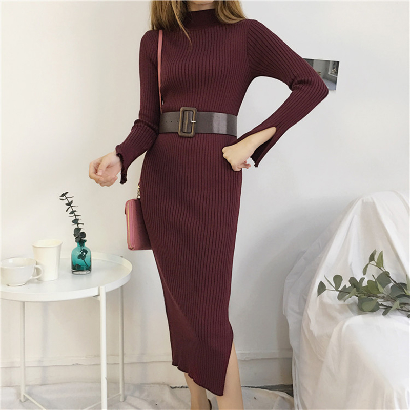 修身顯瘦打底針織連衣裙子秋冬裝新款復古法式少女開叉中長小黑裙