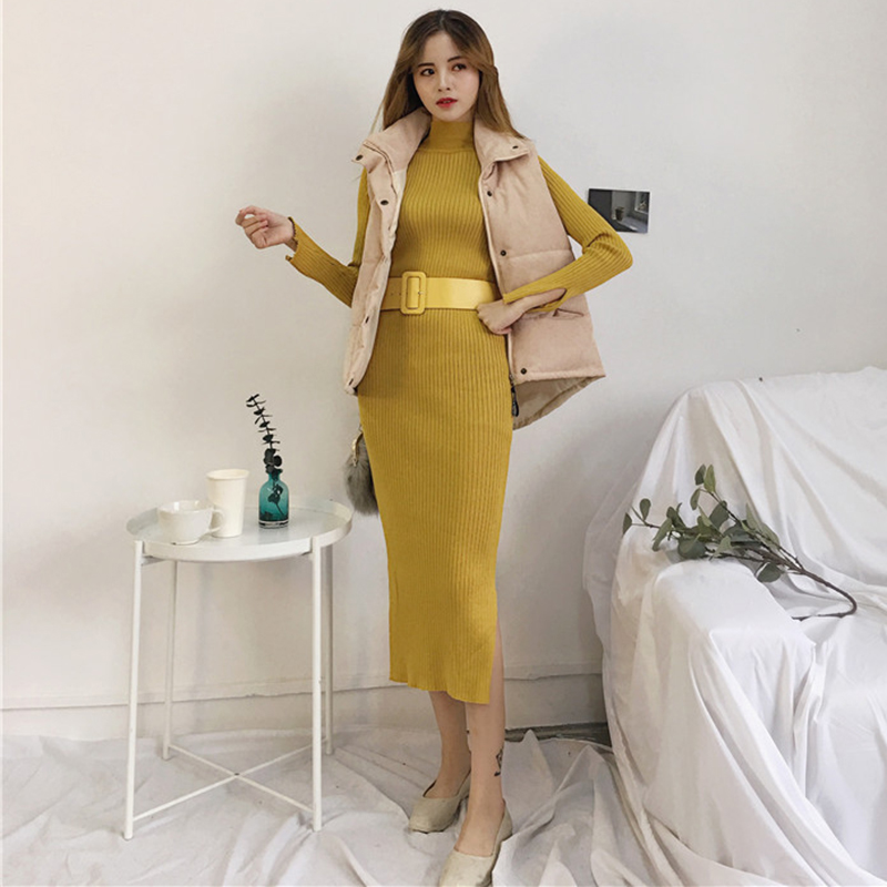 / 修身顯瘦打底針織連衣裙子秋冬裝新款復古法式少女開叉中長小黑裙