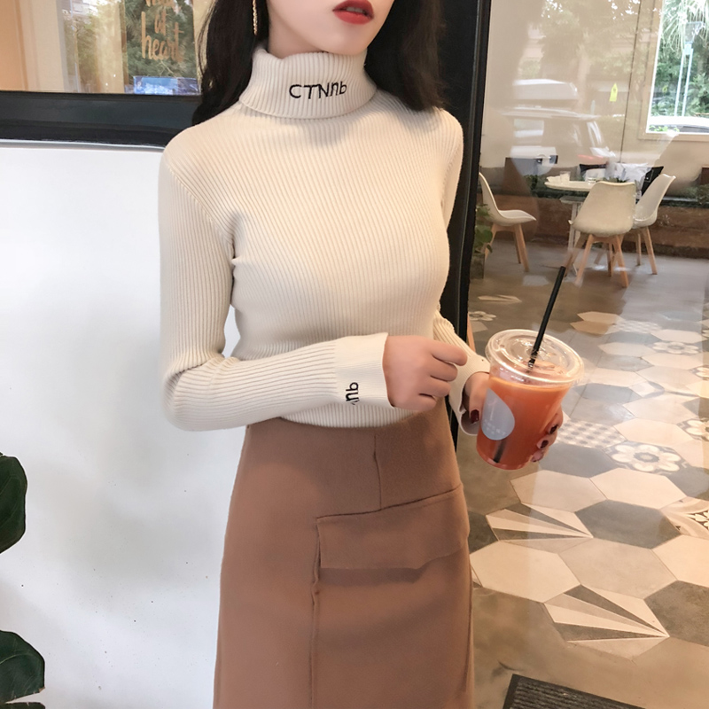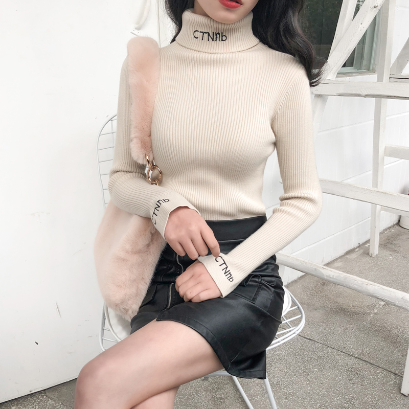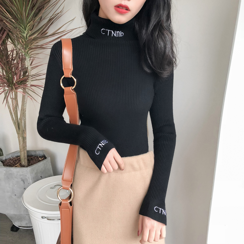 / 秋季新款字母刺繡時尚高領氣質毛衣女長袖修身顯瘦彈力打底針織衫