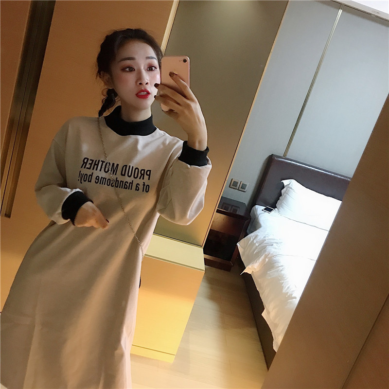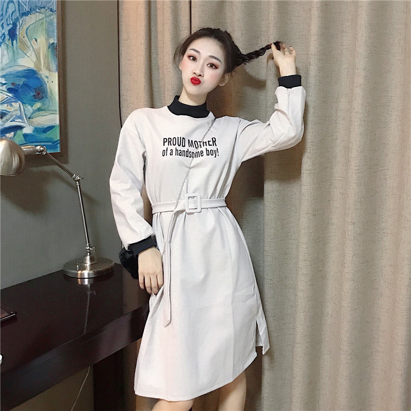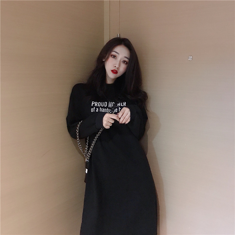 秋冬時尚女裝新款chic簡約百搭字母印花收腰修身顯瘦中長款連衣裙