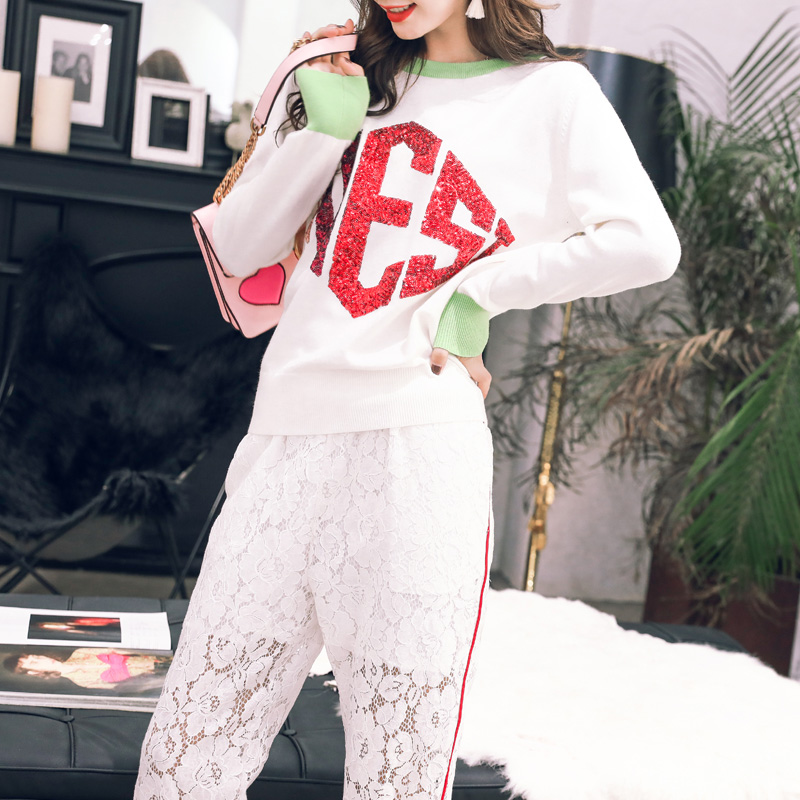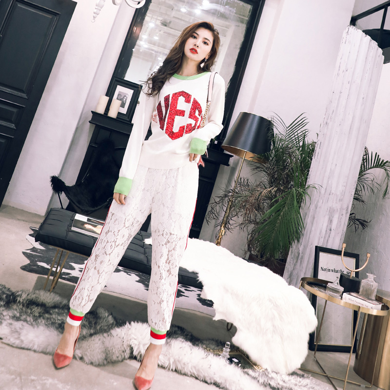 / 名媛氣質2018秋季新款針織上衣衛衣打底衫蕾絲寬松小腿褲兩件套裝