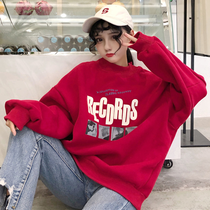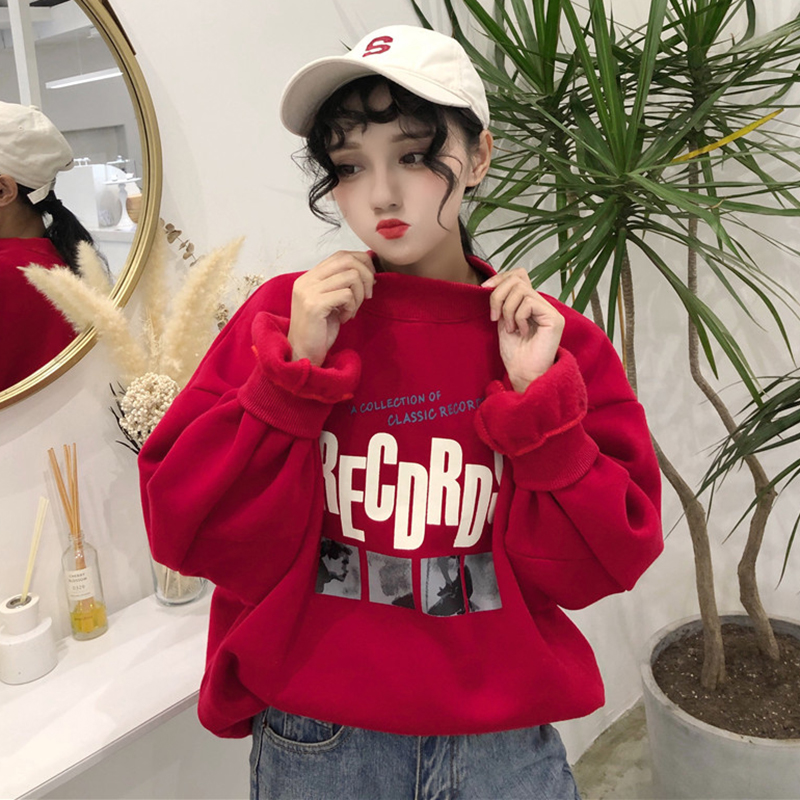 / 小高領字母印花加絨衛衣外套秋冬新款學生寬松套頭保暖長袖上衣女
