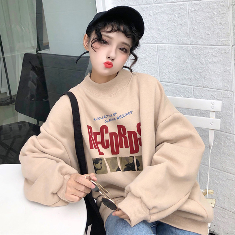 小高領字母印花加絨衛衣外套秋冬新款學生寬松套頭保暖長袖上衣女