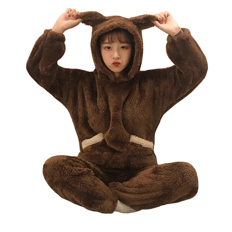 / 秋冬韓版甜美可愛家居服套裝毛絨連帽套頭睡衣+睡褲長褲兩件套女
