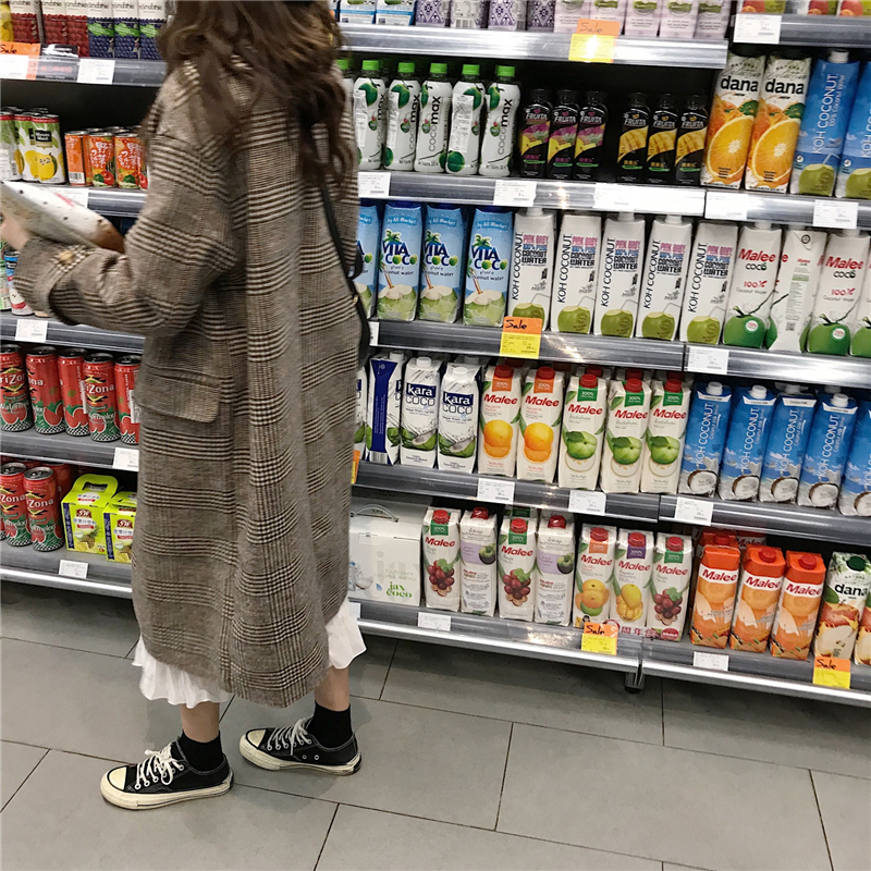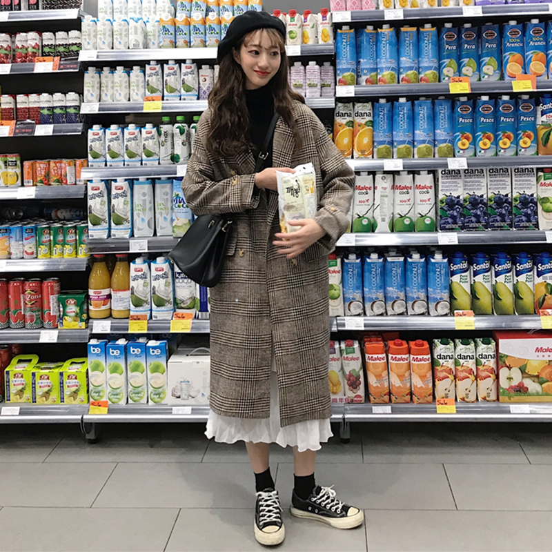 / 2018流行呢子大衣女秋冬裝新款韓版中長款寬松格子翻領毛呢外套潮