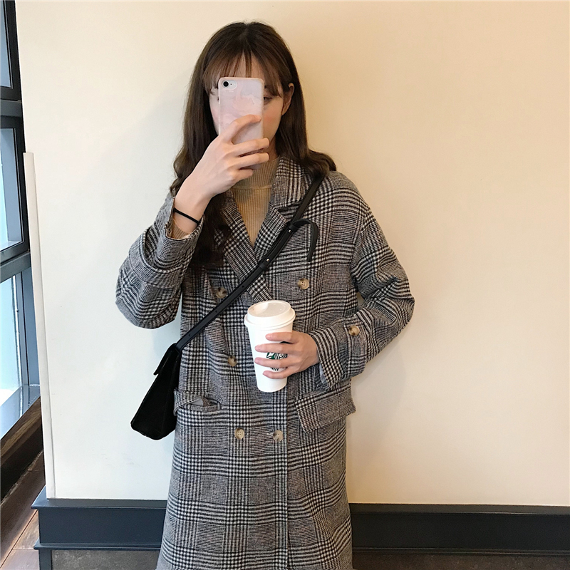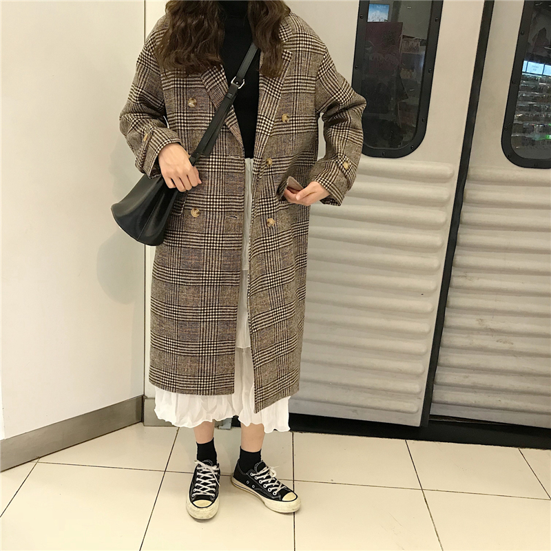 2018流行呢子大衣女秋冬裝新款韓版中長款寬松格子翻領毛呢外套潮