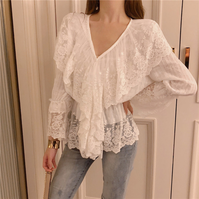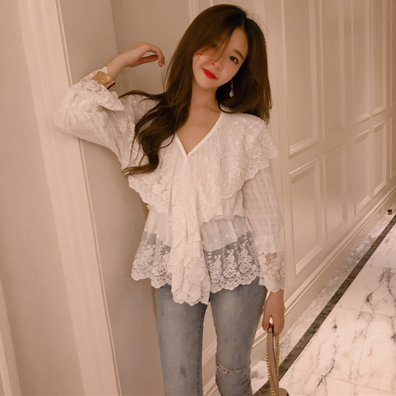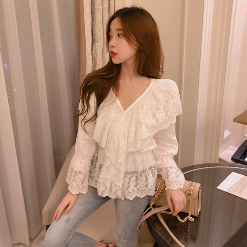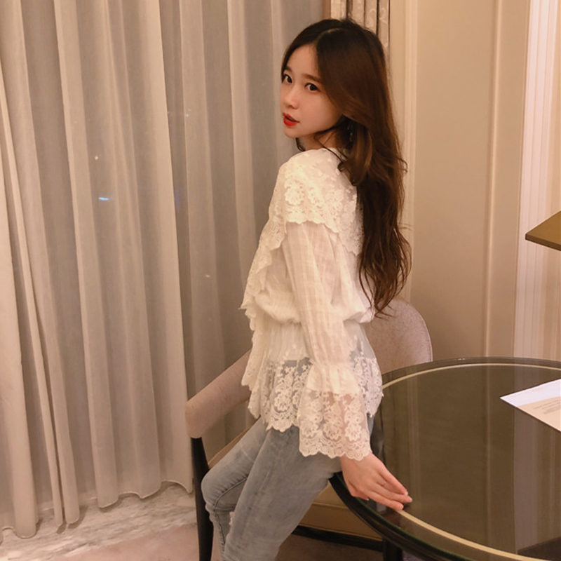 / 寬松荷葉邊V領女秋裝新款收腰洋氣鏤空蕾絲衫氣質白色長袖上衣