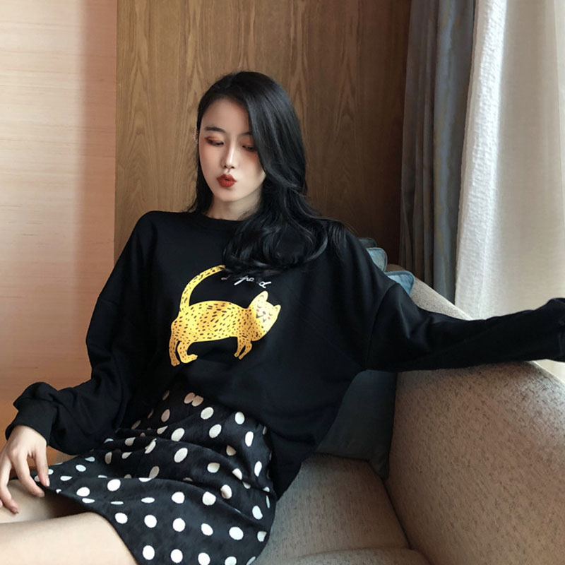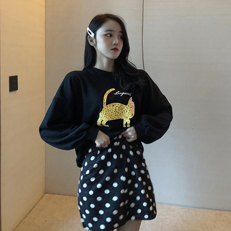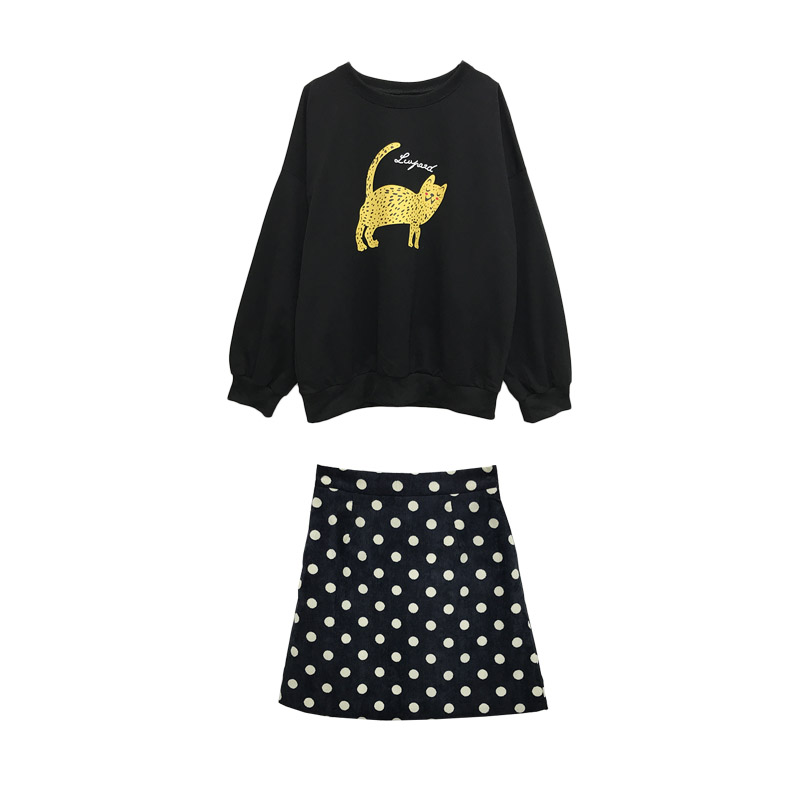 / 女神套裝秋季新款復古港味豹子印花衛衣+波點百搭包臀半身裙短裙