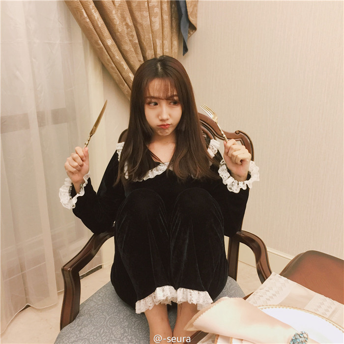 / 秋冬韓版優雅甜美金絲絨蕾絲花邊長袖睡衣睡褲兩件套家居服套裝女