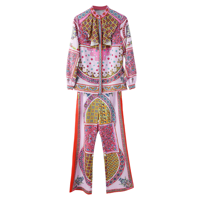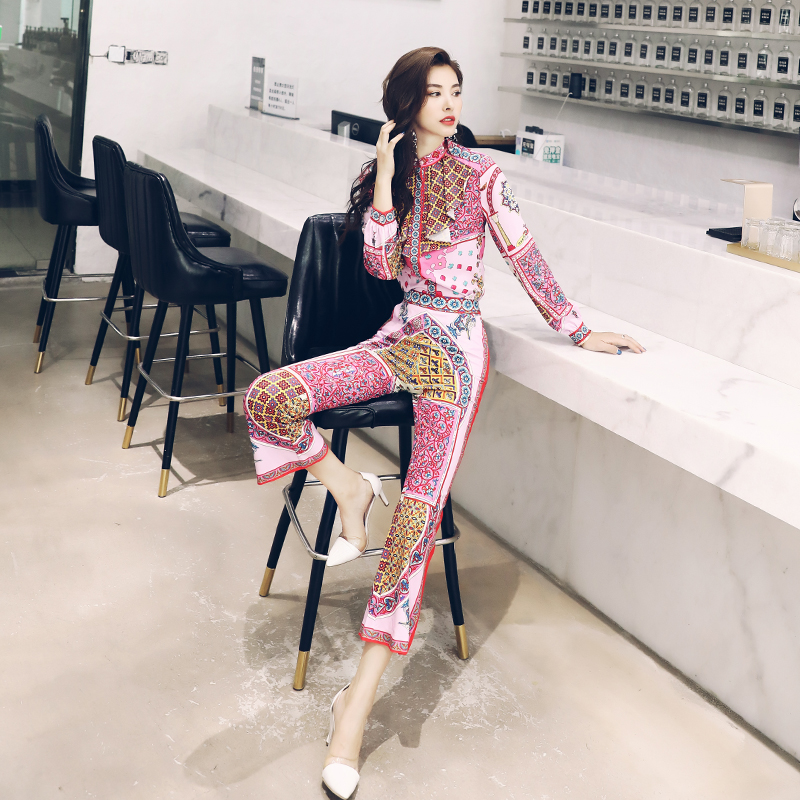 / 印花襯衫套裝女秋裝2018新款時尚氣質顯瘦垂感微喇褲復古港味兩件