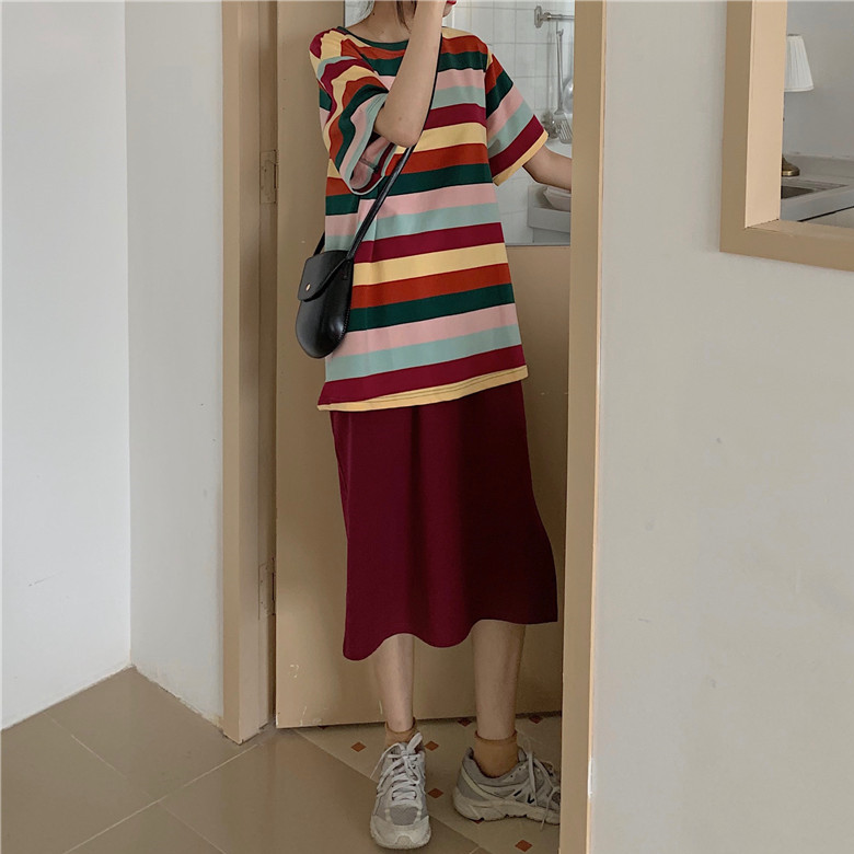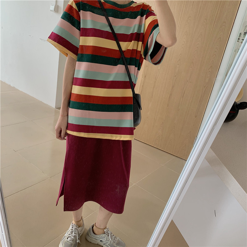 CHACHA 文藝溫柔半身開衩中長裙+古著感少女彩虹條紋T恤港風套裝