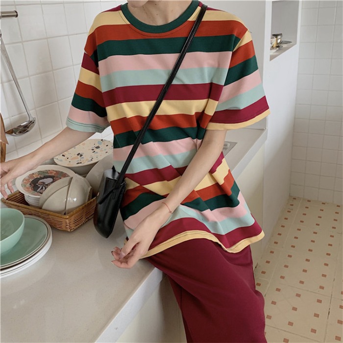 / CHACHA 文藝溫柔半身開衩中長裙+古著感少女彩虹條紋T恤港風套裝