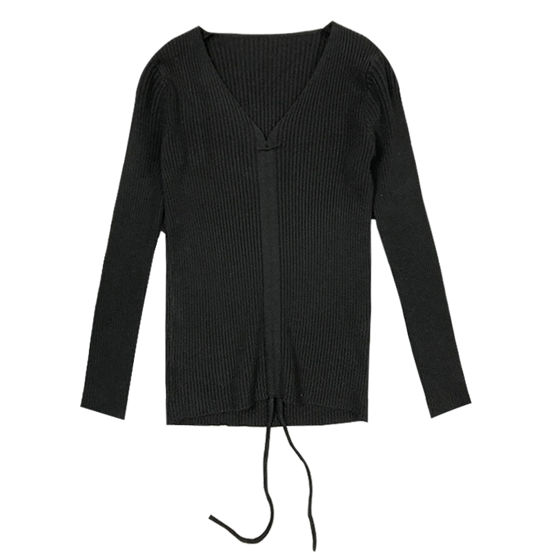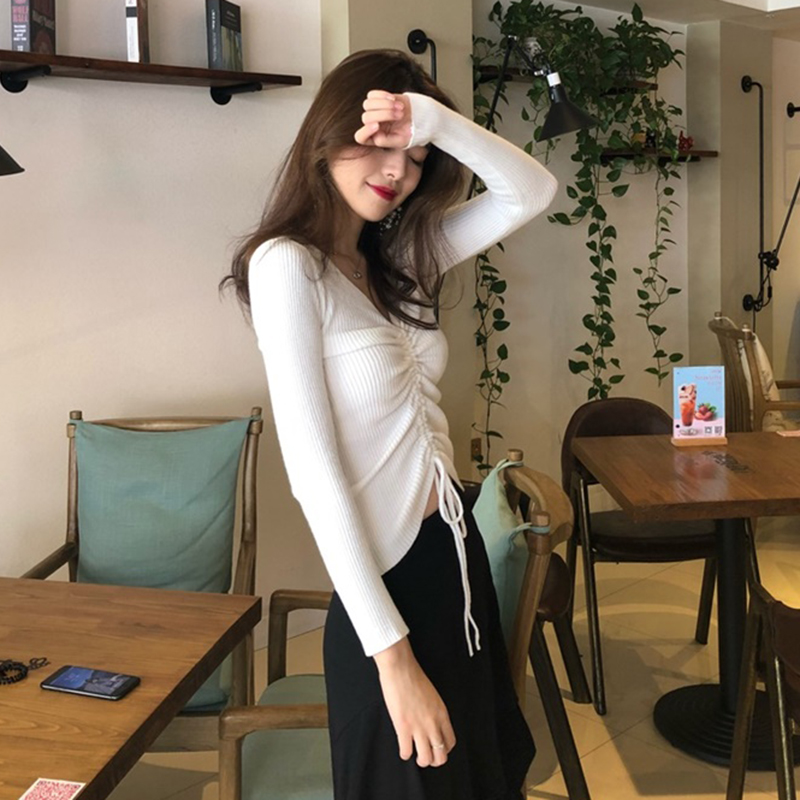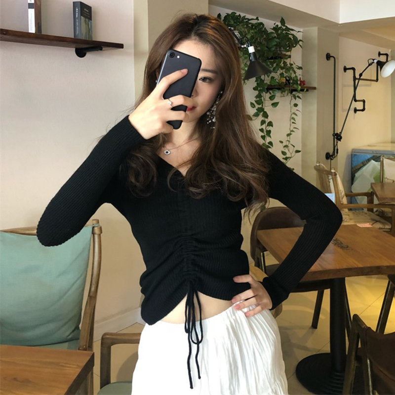 / 秋季2018女裝新款韓版短款V領抽繩針織打底衫女修身顯瘦長袖上衣