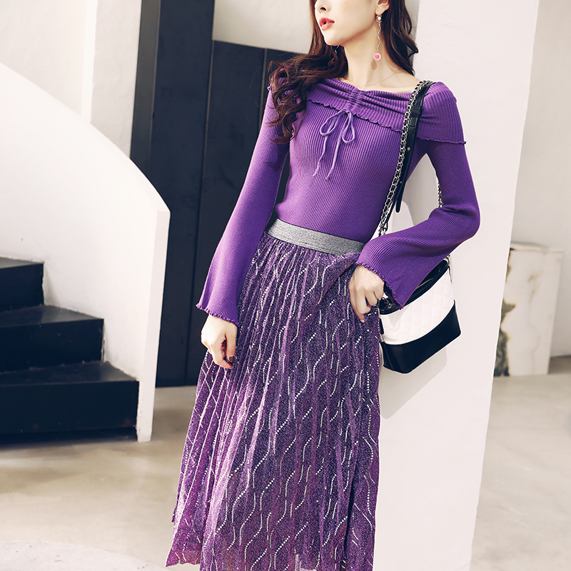 / 名媛氣質一字肩純色修身針織上衣網紗半身裙女2018早秋新款套裝潮