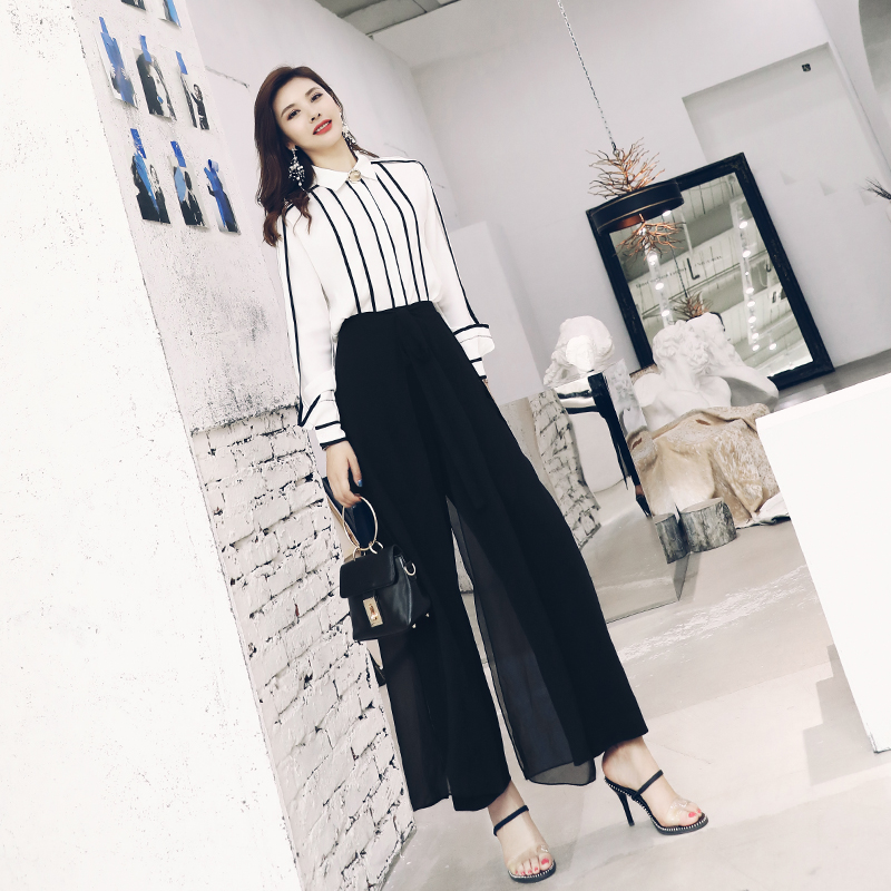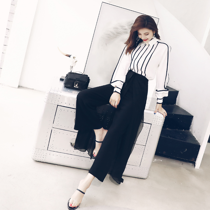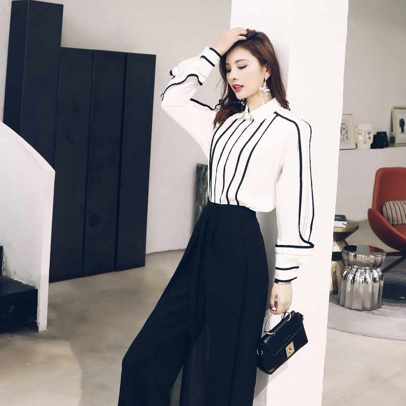 名媛氣質兩件套長袖襯衫上衣休閑修身顯瘦網紗闊腿長褲時尚套裝女