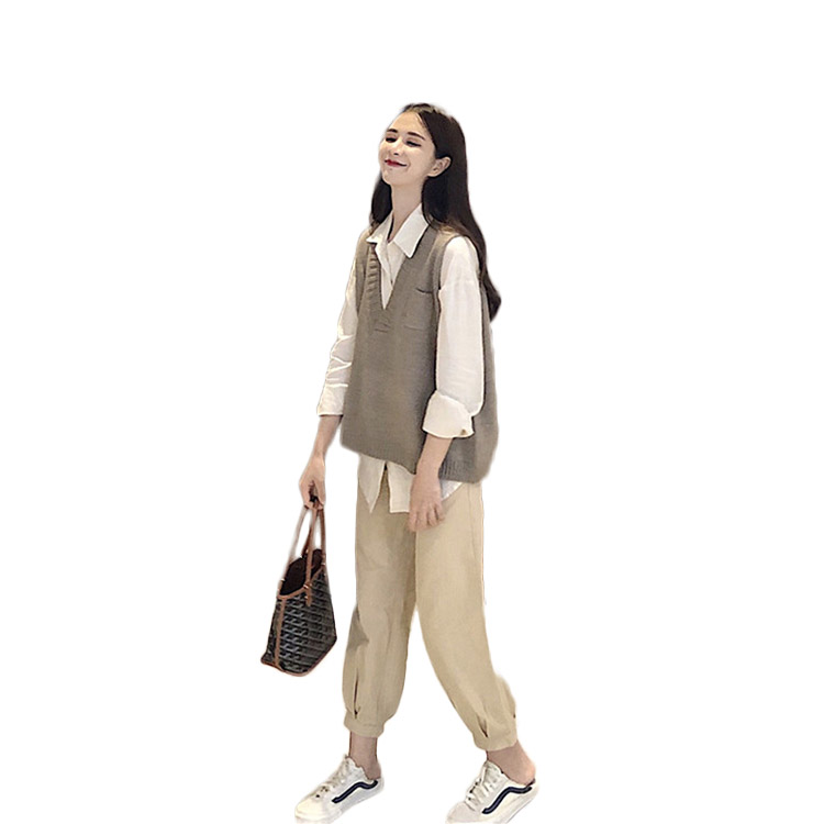 / 秋季套裝女時尚兩件套復古束腳燈籠褲針織馬甲背心內搭長袖襯衫女