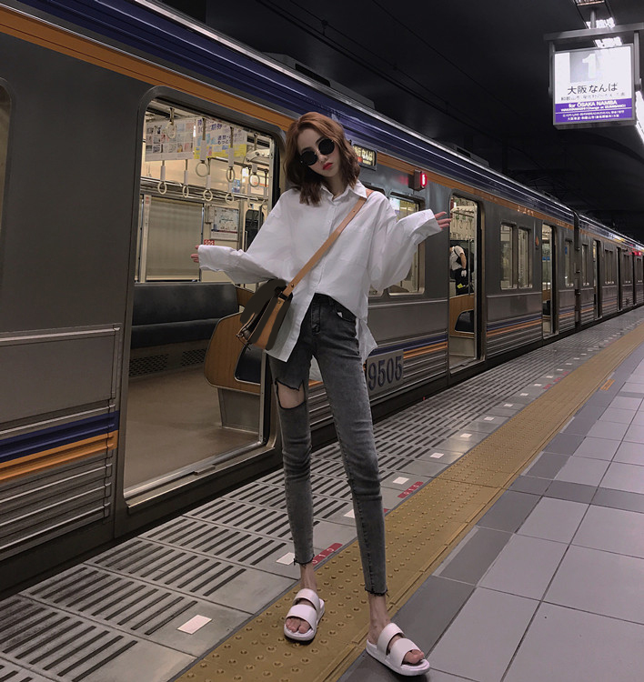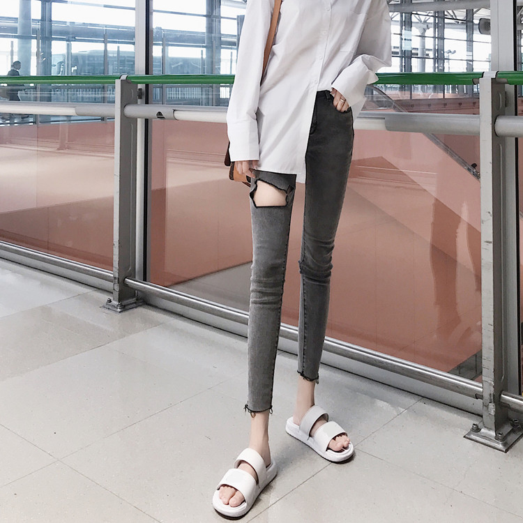高腰時尚破洞復古chic2018新款韓版百搭氣質學生小腳牛仔褲鉛筆褲