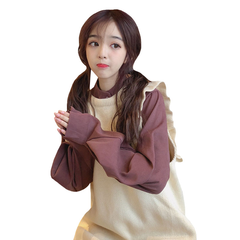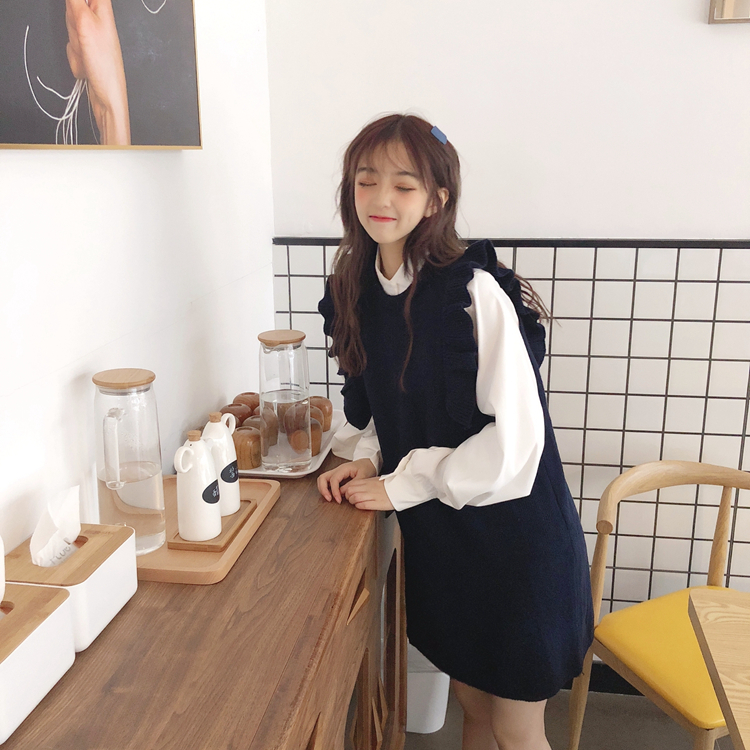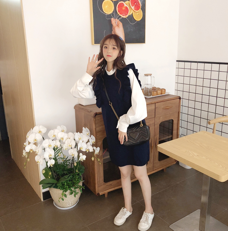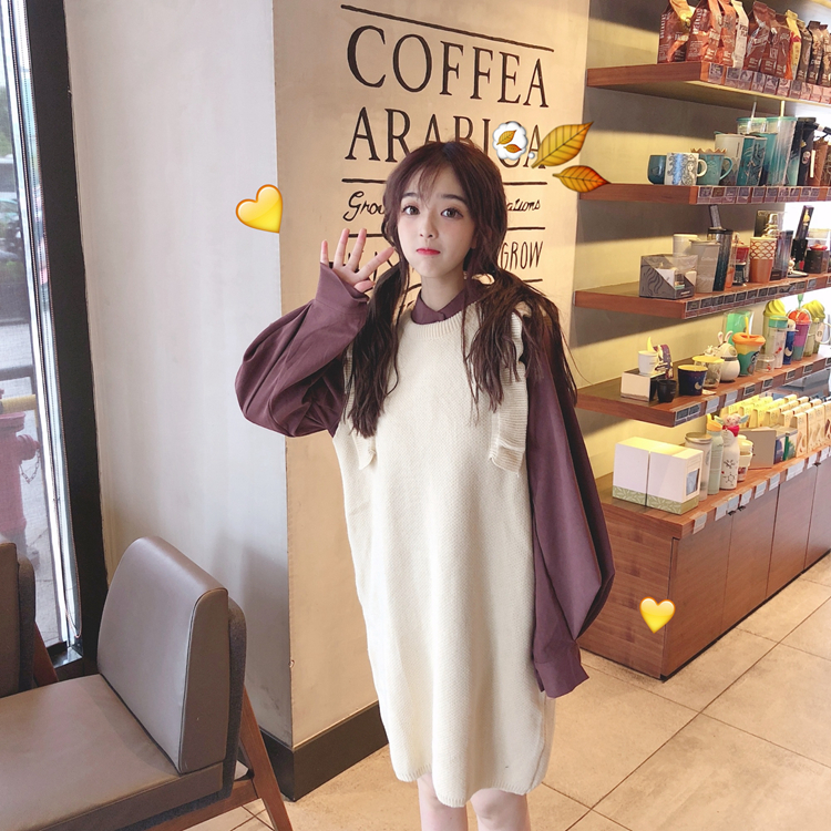 / 韓版時尚休閑套裝秋季女裝中長款針織背心連衣裙+立領襯衣兩件套