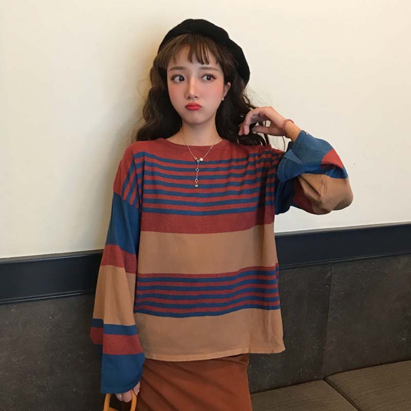/ 時尚拼色條紋慵懶毛衣秋裝女2018新款圓領套頭針織衫休閑長袖上衣