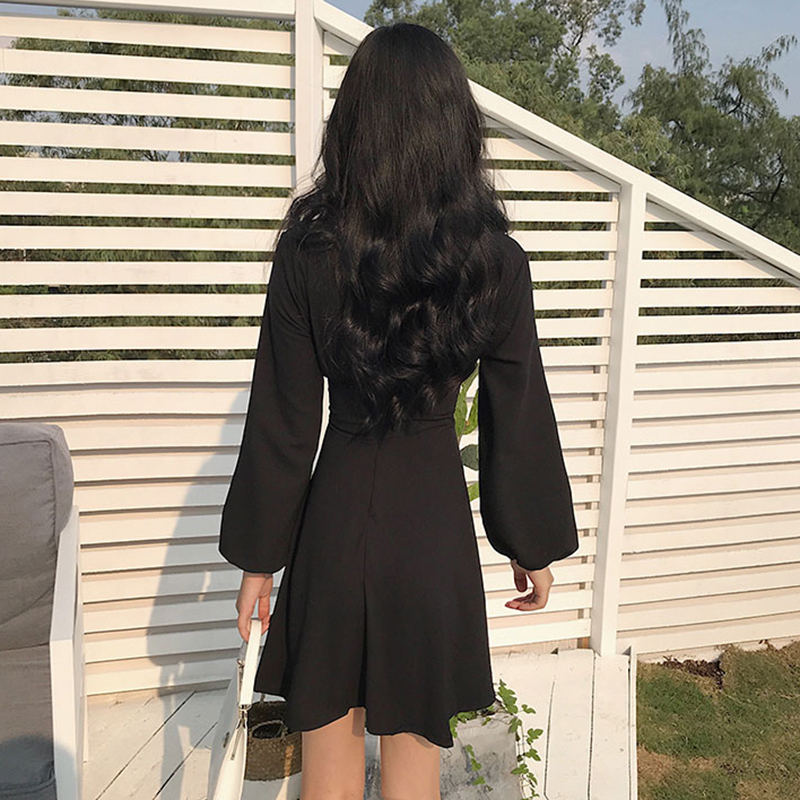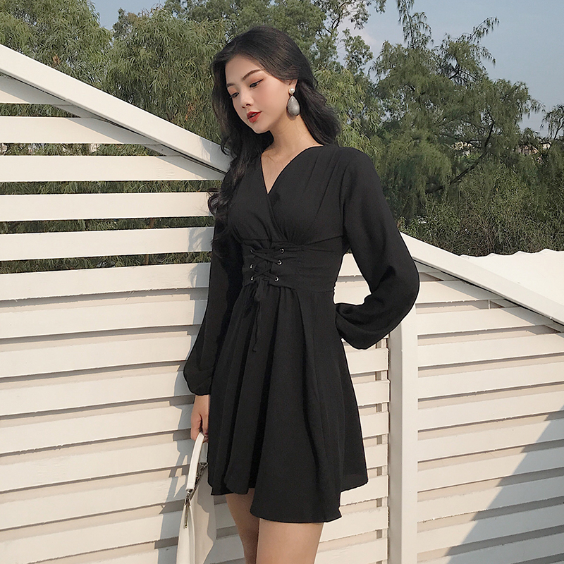 / 秋裝女2018新款修身收腰系帶長袖a字連衣裙溫柔風氣質V領小黑裙子