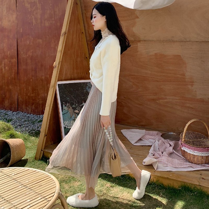 / 御姐套裝女秋冬新款長袖寬松開衫網紗打底衫高腰顯瘦A字半身裙子