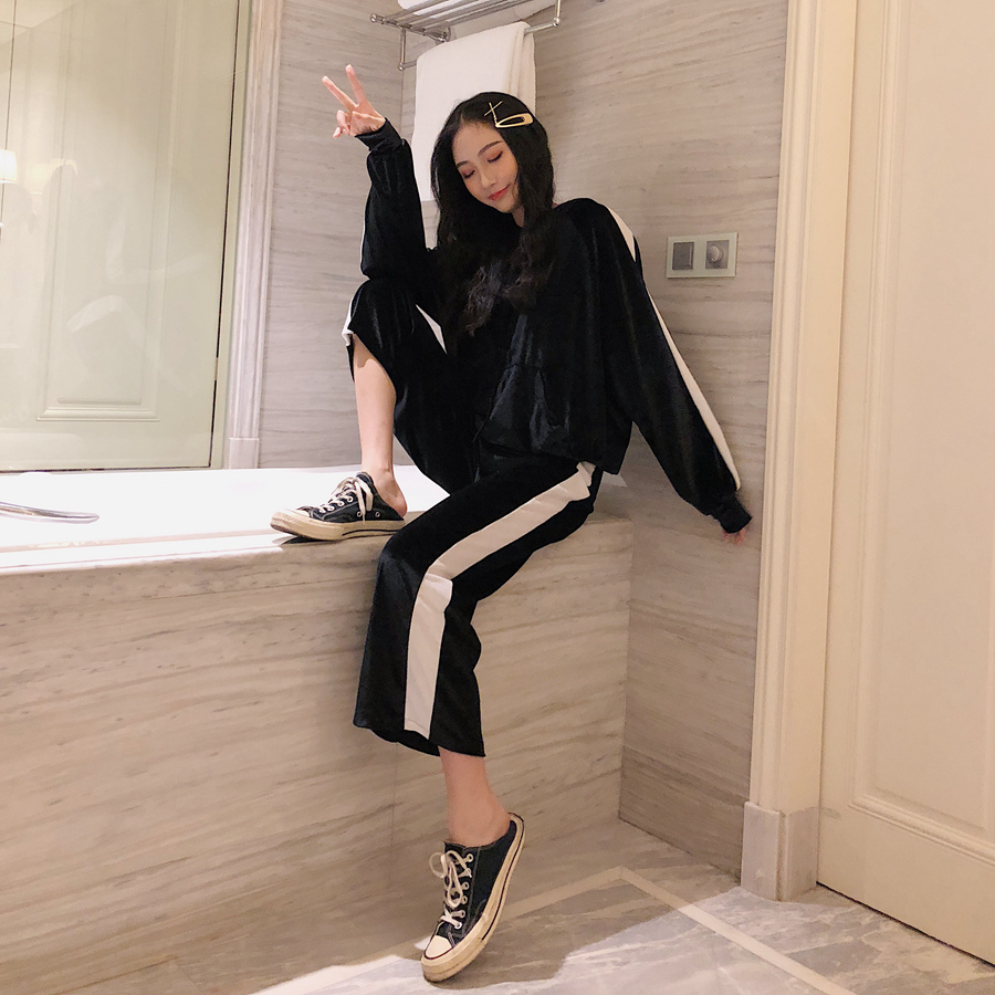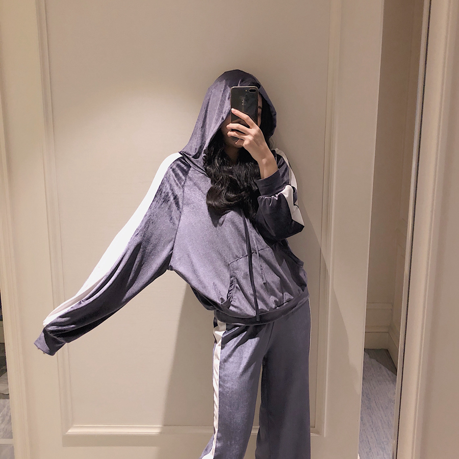 / 港味女神套裝秋冬絲絨連帽套頭拼接衛衣+彈力腰休閑闊腿褲兩件套
