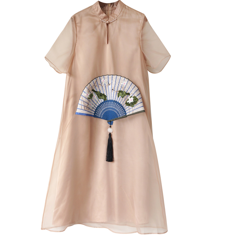 / S秀復古風2018夏季新款半高領五分袖純色流蘇繡花鏤空荷葉邊裙潮