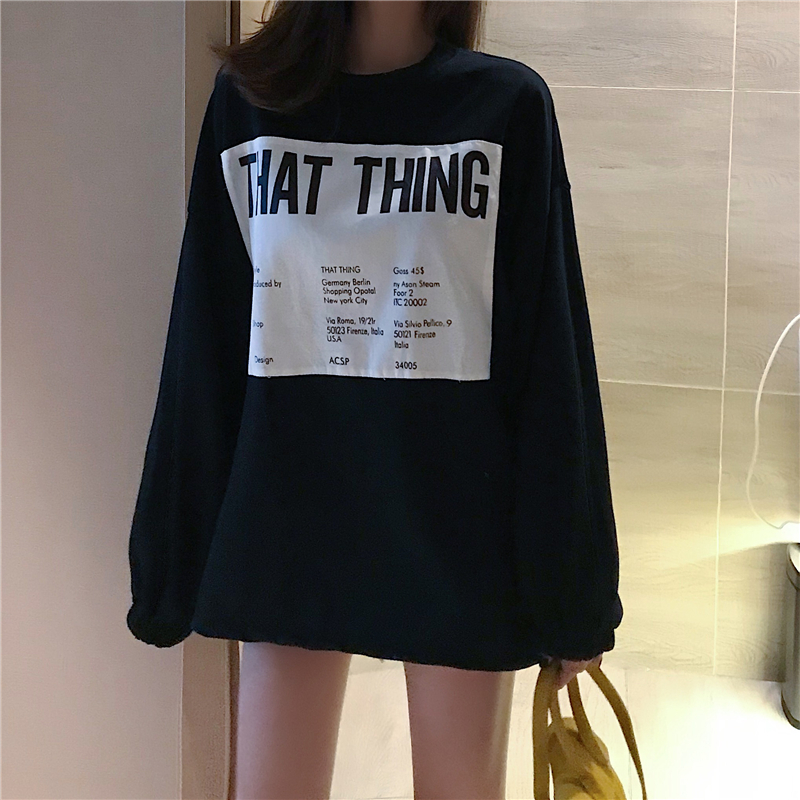 港味復古風秋裝女2018新款百搭帥氣黑色迷彩字母印花加絨套頭衛衣