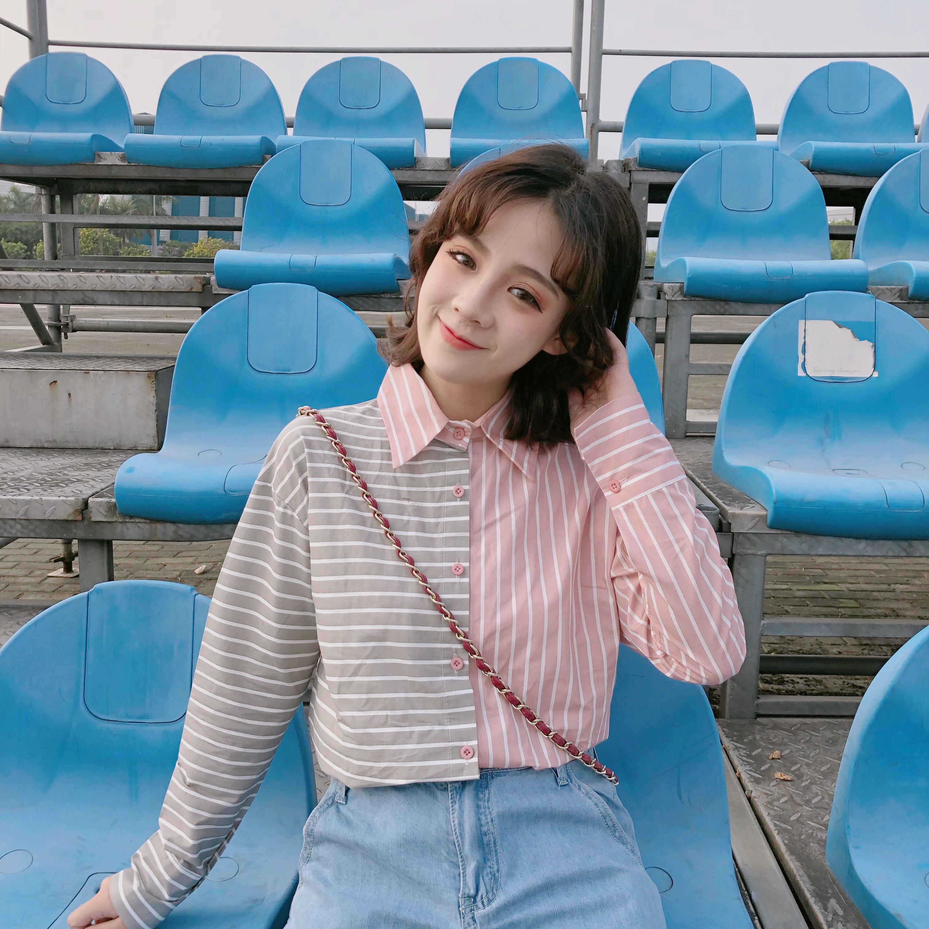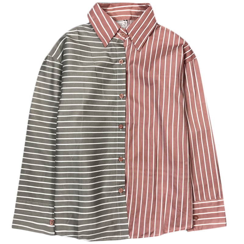 / 早春新款女裝學院風撞色條紋拼接寬松顯瘦學生長袖打底襯衫上衣女