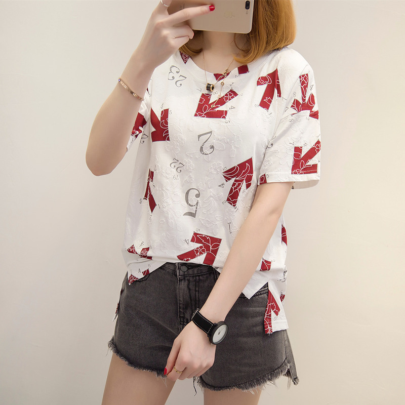 夏裝新款女裝寬松刺繡白色t恤女個性休閑打底百搭韓版體恤衫