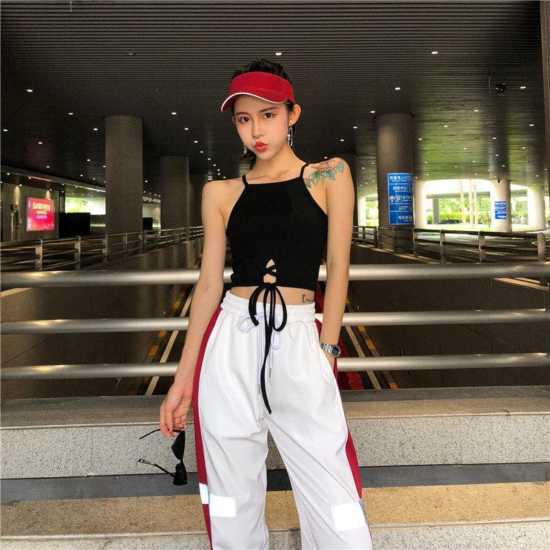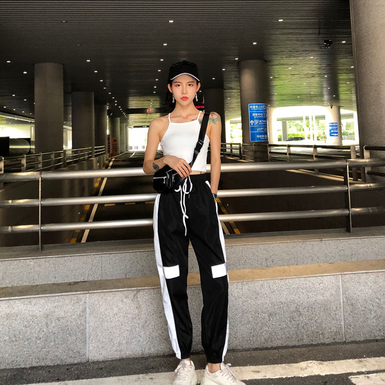 秋裝女2018新款高腰口袋嘻哈寬松束腳工裝褲+背帶露腰T恤女兩件套