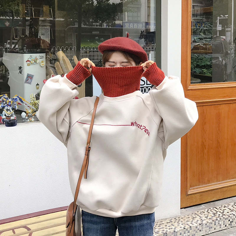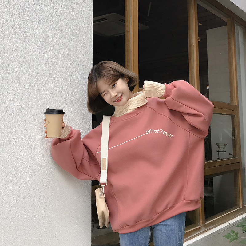 秋冬韓版2018新款撞色毛線拼接高領慵懶風寬松套頭超火衛衣外套女