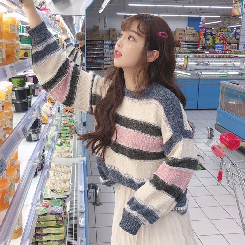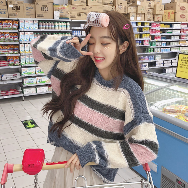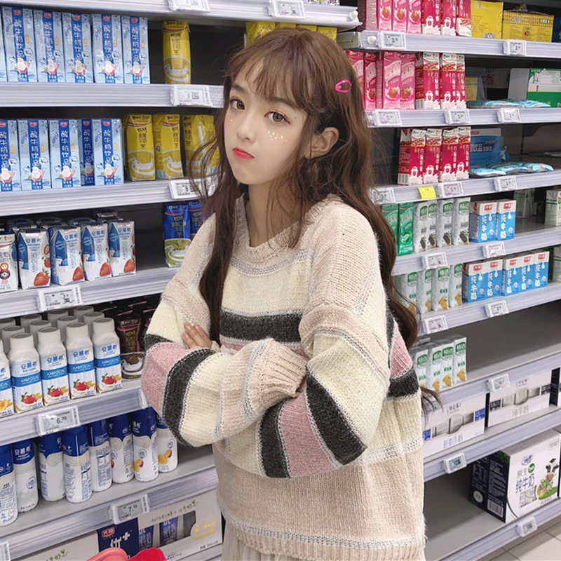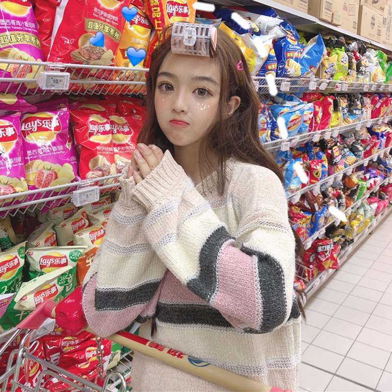 / 清新條紋針織衫秋裝女2018新款甜美少女圓領寬松毛衣簡約長袖上衣