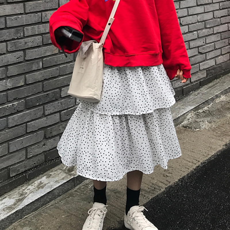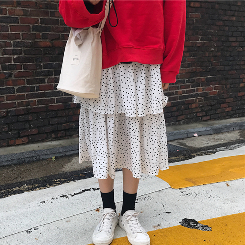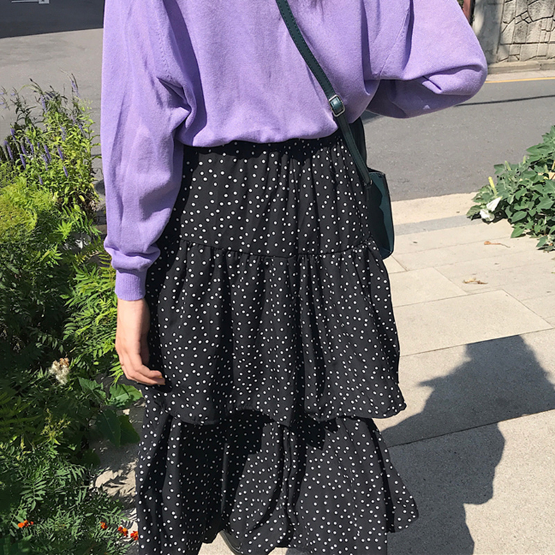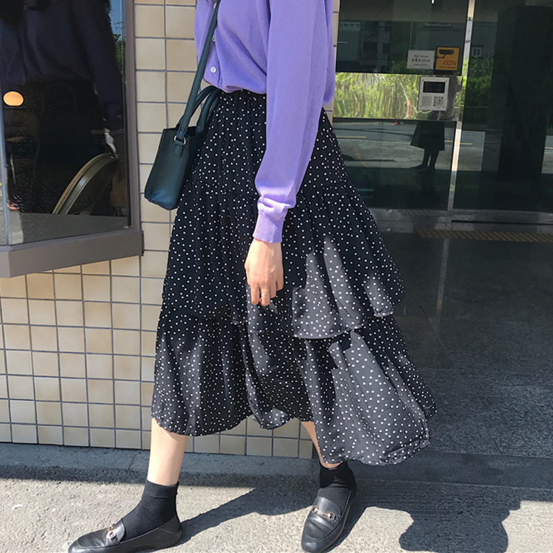 / 復古波點半身裙女裝秋季2018新款高腰a字蛋糕裙顯瘦黑色中長裙子