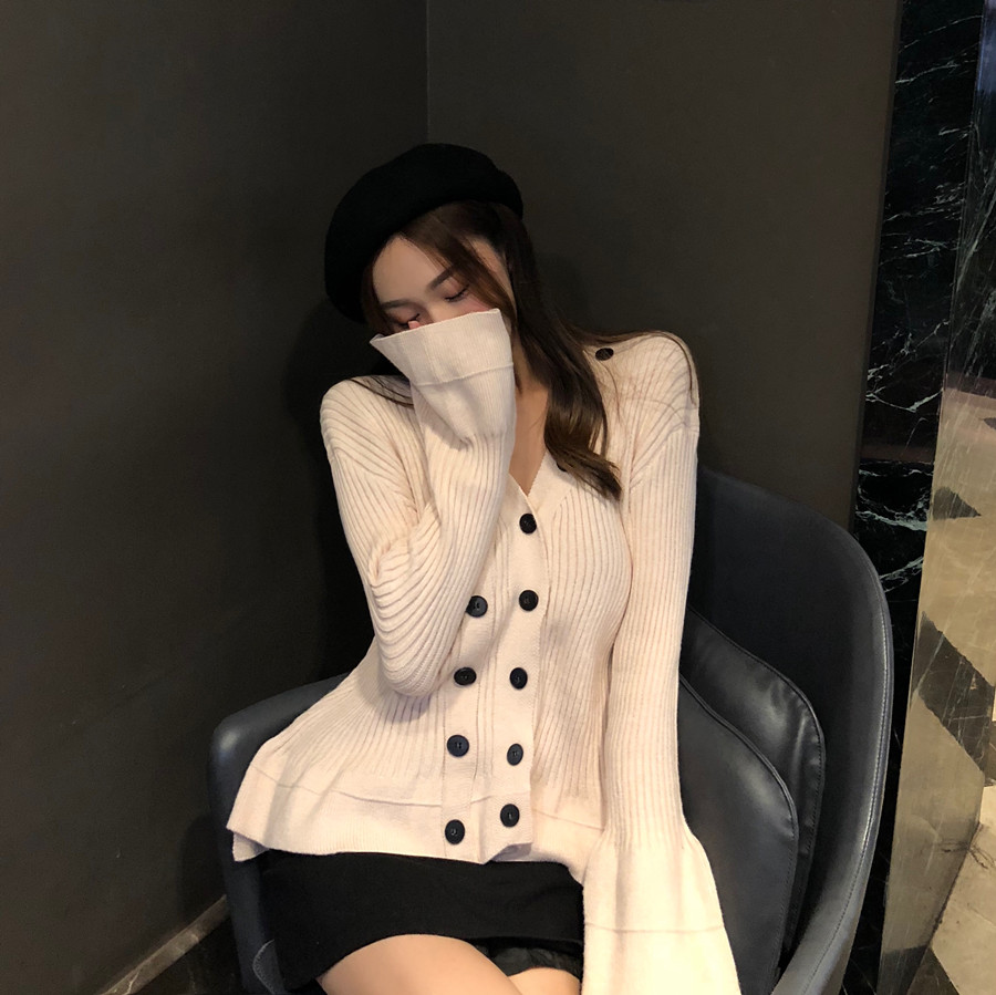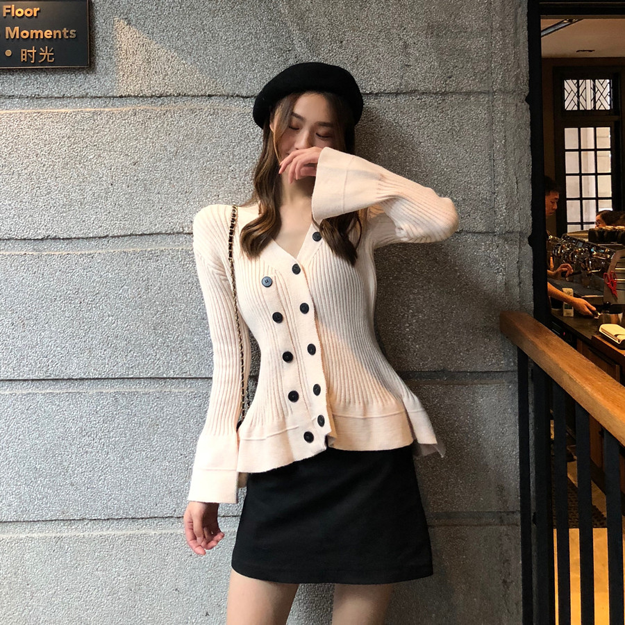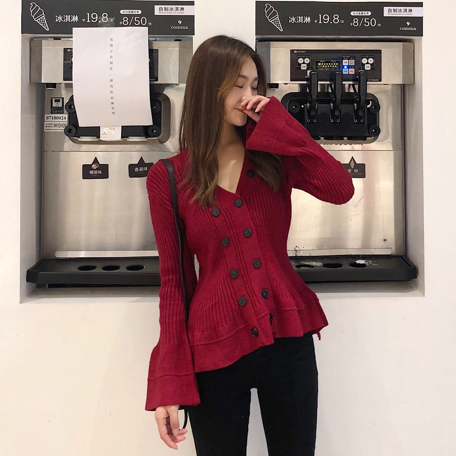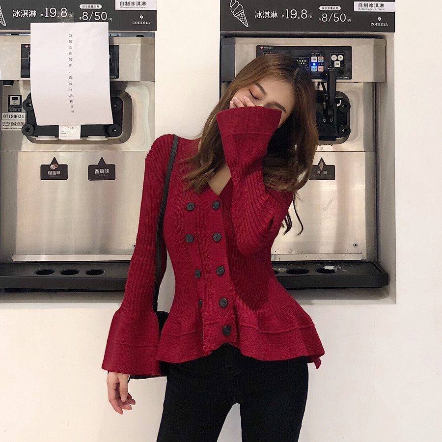 / chic早秋新款韓版純色時尚百搭雙排扣收腰顯瘦喇叭袖V領套頭毛衣