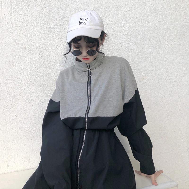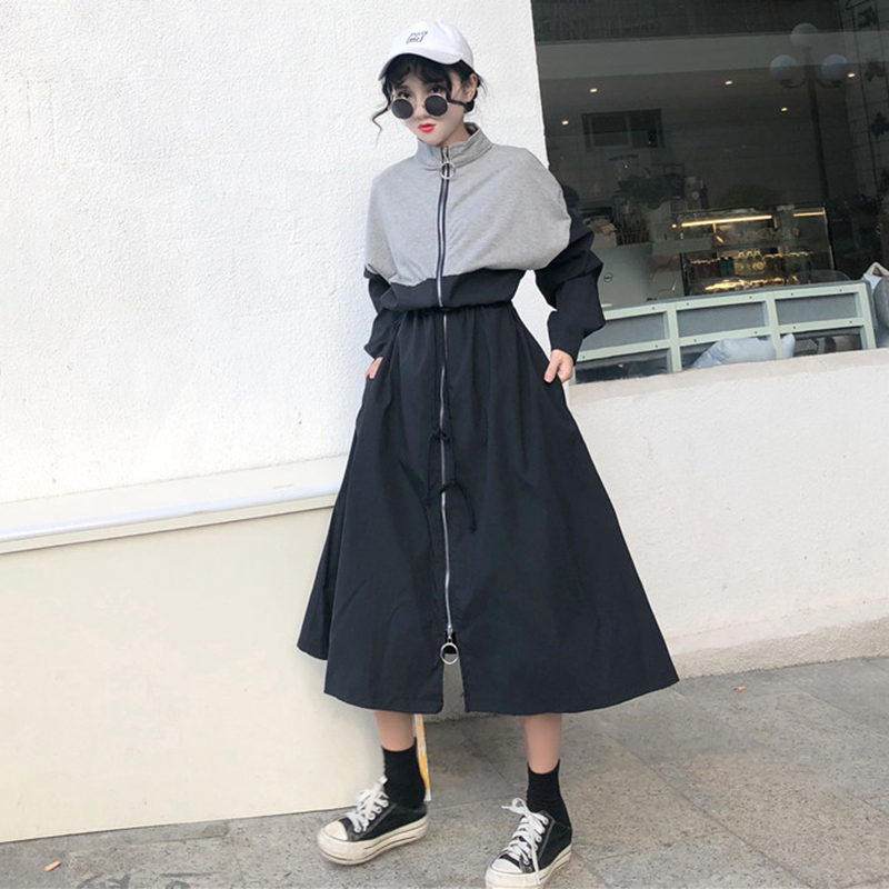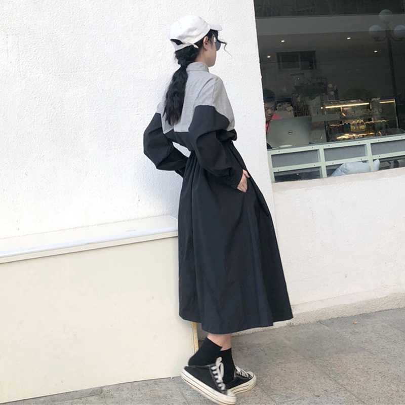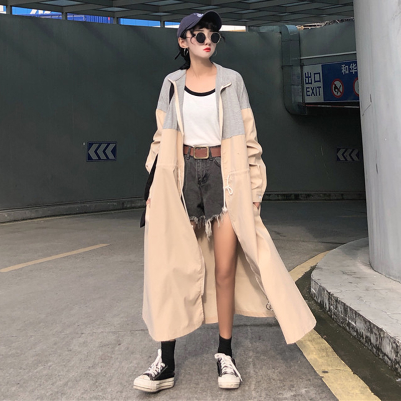 秋冬女裝2018新款韓版時尚拼接寬松立領風衣長款抽繩收腰顯瘦外套