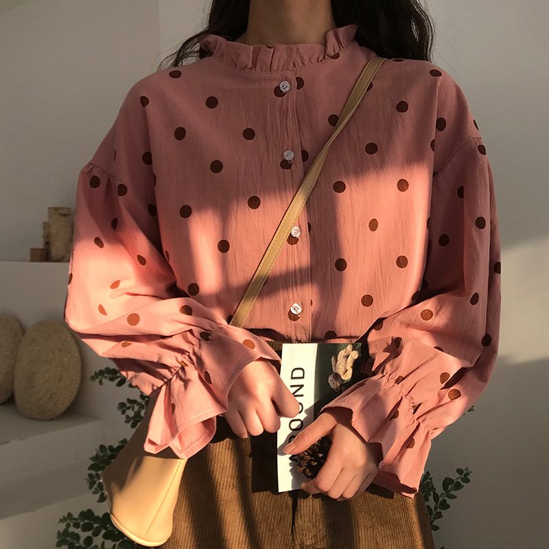 襯衣上衣秋裝女2018新款韓版寬松波點燈籠長袖百搭學生休閑襯衫潮